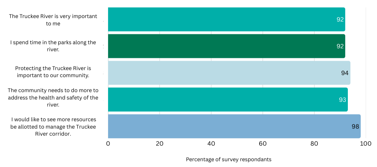 Northern Nevadans appreciate the Truckee River and want to protect it. According to our 2025 Community Survey, 92% of respondents say the Truckee River is very important to them, 92% spend time in parks along the river, and 94% say protecting the Truckee River is important to our community. 93% tell us that the community needs to do more to address the health and safety of the river and 98% would like to see more resources be allotted to manage the Truckee River corridor.